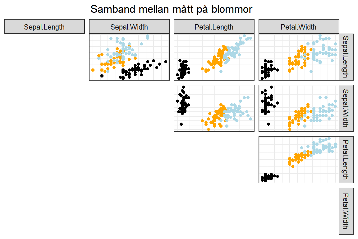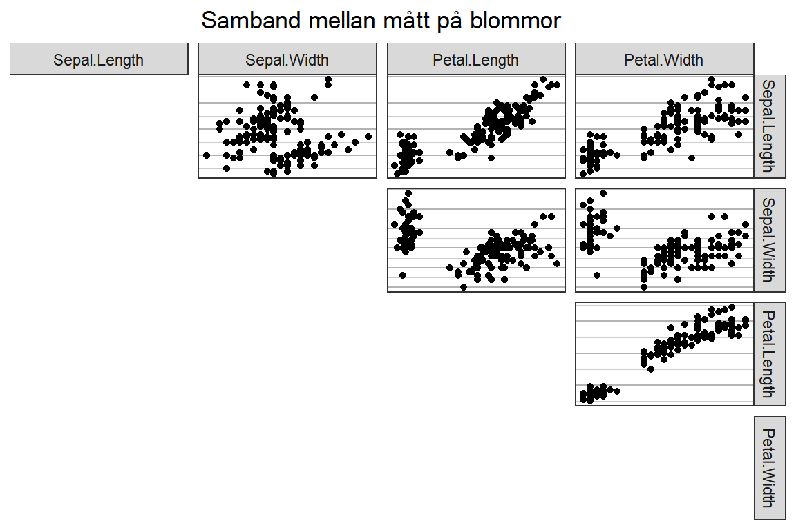 Nedanstående kod kommer skapa spridningsdiagram i den nedre diagonalen över de fyra kontinuerliga variablerna som ligger på position 1:4 i datamaterialet iris. Vi väljer också här att plocka bort skalvärden på axlarna då syftet med dessa spridningsdiagram är att visa sambandet mellan variabler, och inte specifika värden som variablerna eller observationer förhåller sig till. Att vi tar bort skalvärden möjliggör också en större rityta som behövs om vi har ett flertal variabler som ska visualiseras. Vi väljer också här att ange att den diagonalen och den övre diagonalen ska vara tom.